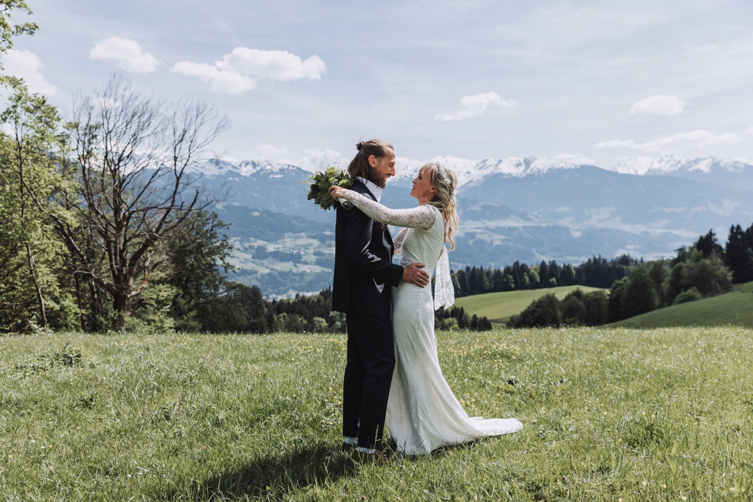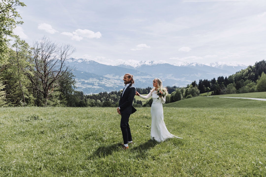 The alpine meadow was the perfect place for the first look. Erwin stood with his back to Katrin, while she slowly approached him. How exciting it must be when you can hear your future wife, but not see her yet?! The tension grew as she finally reached him and turned him around. It was so beautiful! We all had to laugh a bit at this ultra-romantic moment, because although we hadn’t really staged it, the breathtaking landscape made us feel like we were part of a movie.