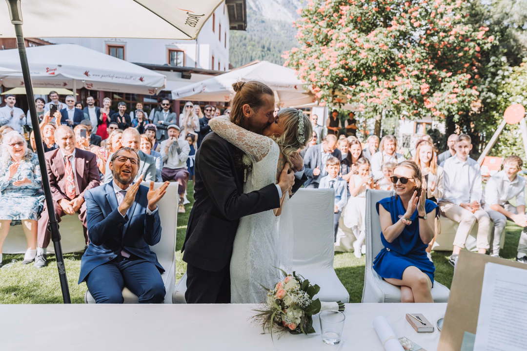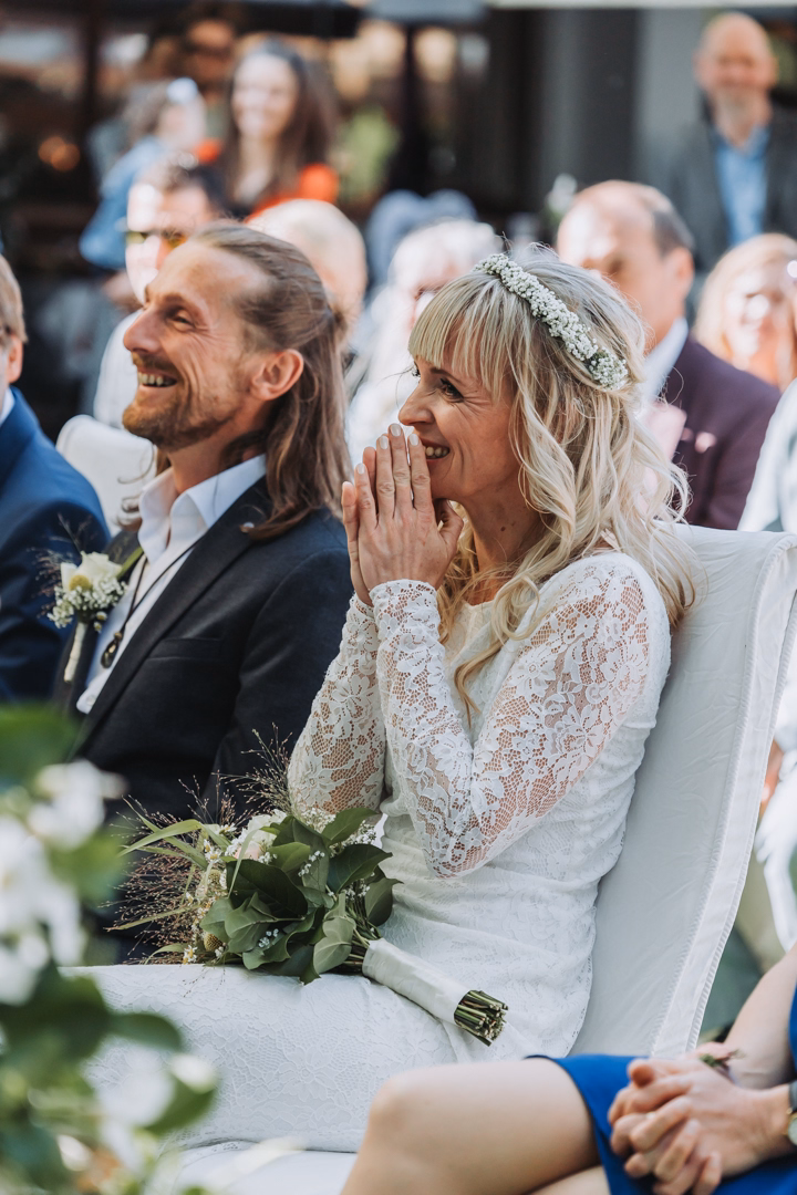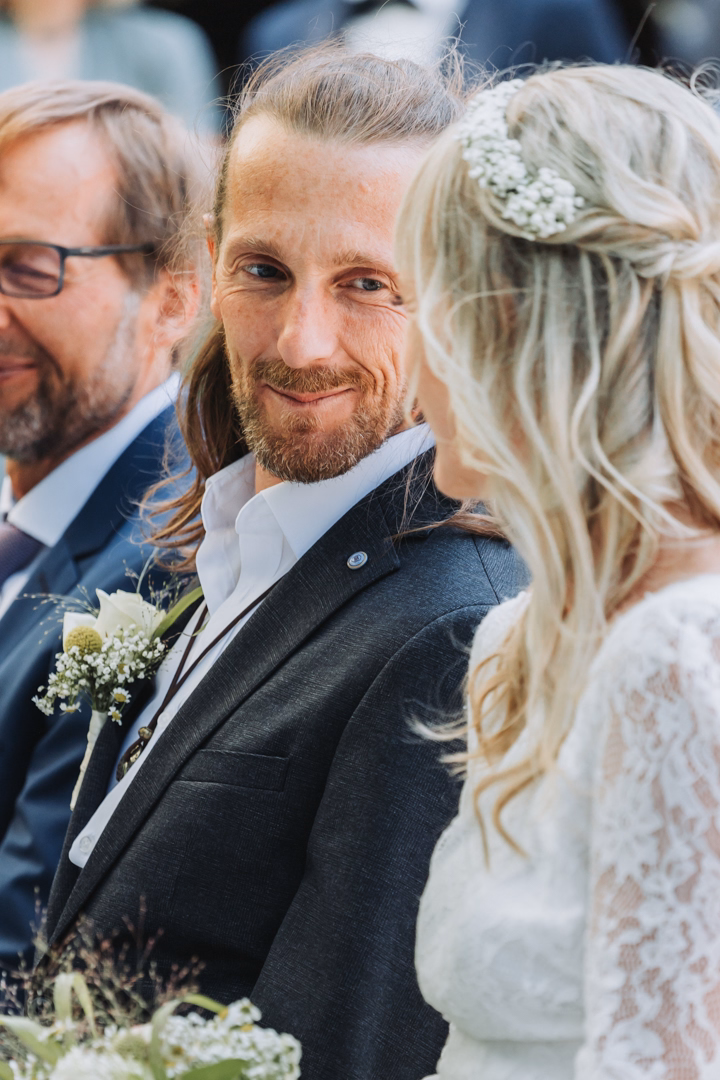 The wedding ceremony took place in the green garden of Gasthof Marschall, with the sun still shining brightly. All the guests were warmly welcomed, and the celebrant Kathrin Steinhuber had prepared a wonderful and humorous speech that was well received by the couple and the guests. The photography was effortless, and I often had to laugh at the funny things Kathrin shared about the couple.